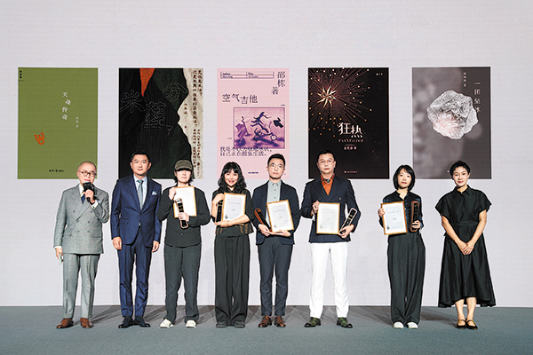Jack Liao (second left), vice-president of Blancpain China, and Liu Ruilin (right), founder of Imaginist, present prizes to the short-listed authors at the award ceremony, as Leung Man-tao, chief consultant of Imaginist, speaks at the event. The authors are (from left to right) Fei Ying (third left), Ning Buyuan, Shao Dong, Wang Ruoxu and Yang Zhihan.[Photo provided to China Daily]