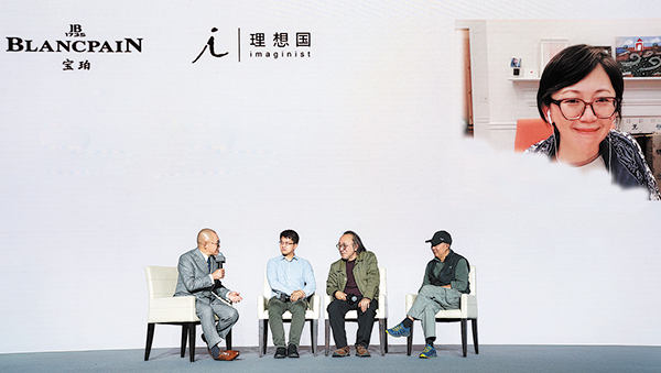 Leung Man-tao (left) talks with the judges on this year's jury at the award ceremony: (from left) Ma Boyong (second left), Tang Nuo and Ye Zhaoyan.[Photo provided to China Daily]