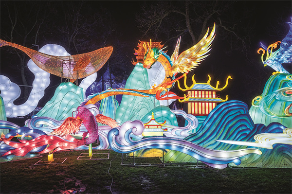 Mythical creatures described in Shan Hai Jing (Classic of Mountains and Seas), an ancient work of Chinese literature, are recreated at the Yuyuan Garden Lantern Show in Paris.[Photo provided to China Daily]
