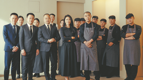 Zhao and her chef Dai Jun (fifth from left, front row), with the restaurant's service and cooking team. CHINA DAILY