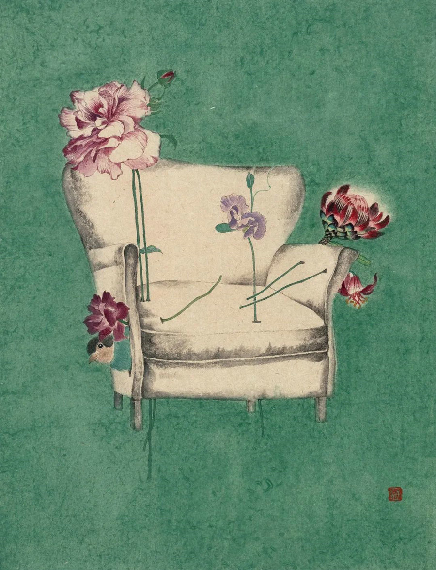 More Viewpoints, Wang's solo exhibition now on at a gallery of Rongbao Zhai's headquarters in Beijing, opens the audience's eyes to this vigorous world she has built. Mountain rocks, butterflies, all sorts of flowers are placed in the same composition with sofas, chairs and cars to show a mysterious, supernatural realm by which, Wang, also an assistant professor of Central Academy of Fine Arts, seeks for spirituality and to redefine people's perspectives of seeing nature.