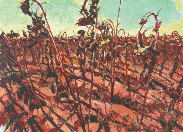 "I was suddenly confronted with an expanse of withering sunflowers standing in the setting sun," he says. "And they struck me as if they were made of steel and copper, blended with the earth."