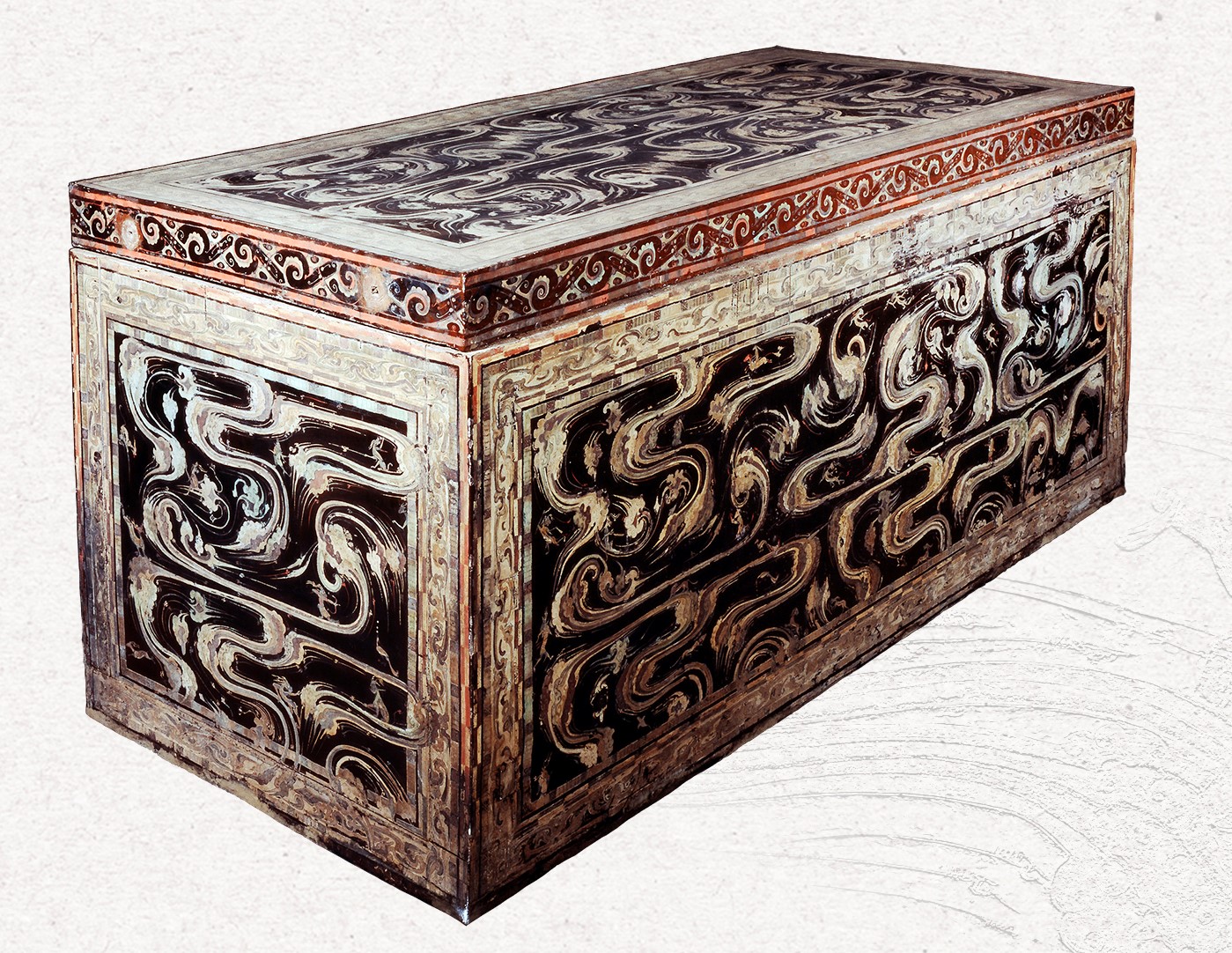 The painings unearthed from Western Han Dynasty Tombs at Mawangdui, Changsha, Hunan Province, can be regarded as masterpieces of tomb chamber art from the early Han Dynasty. These tombs were built in the early 2nd century BC, and the wooden coffins inside the tombs were composed of multiple layers. Unlike the tombs of the Eastern Zhou Dynasty, the tombs at Mawangdui are adorned with complex paintings almost everywhere, such as on banners, coffin surfaces and hanging objects on the tomb walls... The painted images on various objects form a "painting program," which complements the functions and symbolic meanings of the funerary architecture. In Tomb No. 1, there are four nested coffins of different sizes. The first layer, which is also the outermost layer, is completely painted in black to represent death and the underworld. Therefore, the painted images on all the layers sealed inside are not intended for the living to appreciate, but are designed for the deceased, with themes that hope the deceased will be blessed in the underworld and ascend to heaven. The second layer also has a black background, but it is decorated with flowing cloud patterns and divine beings and auspicious birds and animals wandering in the vast universe. At the lower part of the front end of the coffin, a very small figure is painted, but only her upper body is depicted, apparently indicating that she is entering this mysterious world. The third layer of the coffin is painted with a bright red background, and the decorative patterns include some divine beasts and winged immortals, which are painted on both sides of Kunlun Mountain composed of three peaks. On the fourth layer, the innermost layer of the coffin, the excavators discovered a silk painting measuring about two meters long.