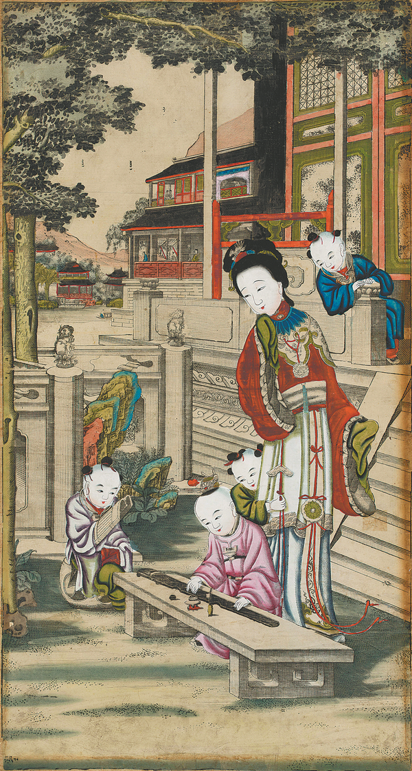 That message was further spread through printmaking. The exhibition includes two etchings on paper created in 1775 by English engraver John June that were based on the drawings of the German draftsman Augustine Heckel, who, in turn, based his work on a Chinese painting of tilling and weaving.