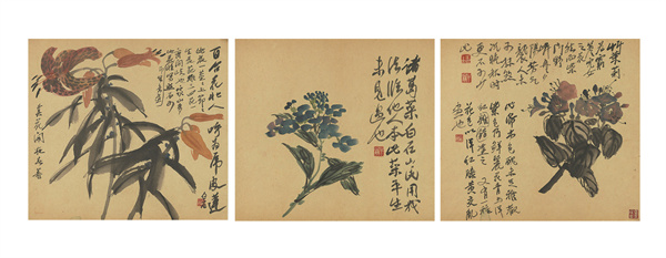 Qi Baishi's three paintings from an album of flowers are highlights of Rustic Paper, Great Art, an ongoing exhibition at the Art Museum of the Beijing Fine Art Academy to mark the 160th anniversary of the ink artist's birth.[Photo provided to China Daily]