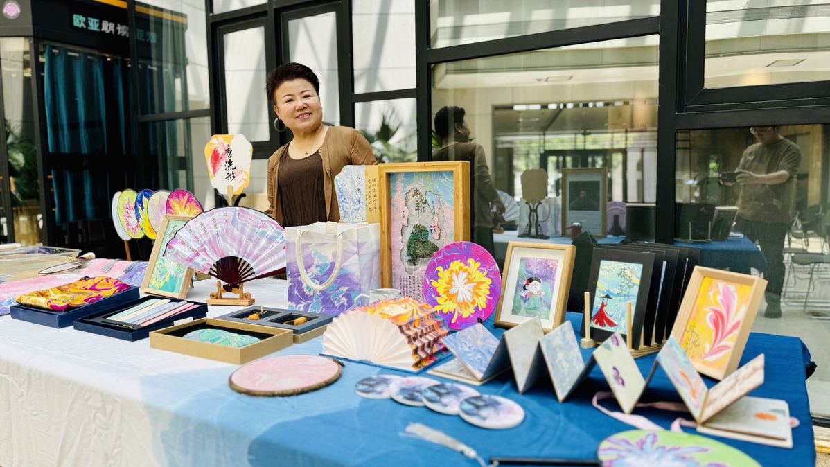 Zhang Shuangmin, 53, introduces a wide range of products featuring the art of tangliucai at a university in Xi'an, Shaanxi province. [Photo provided to China Daily]