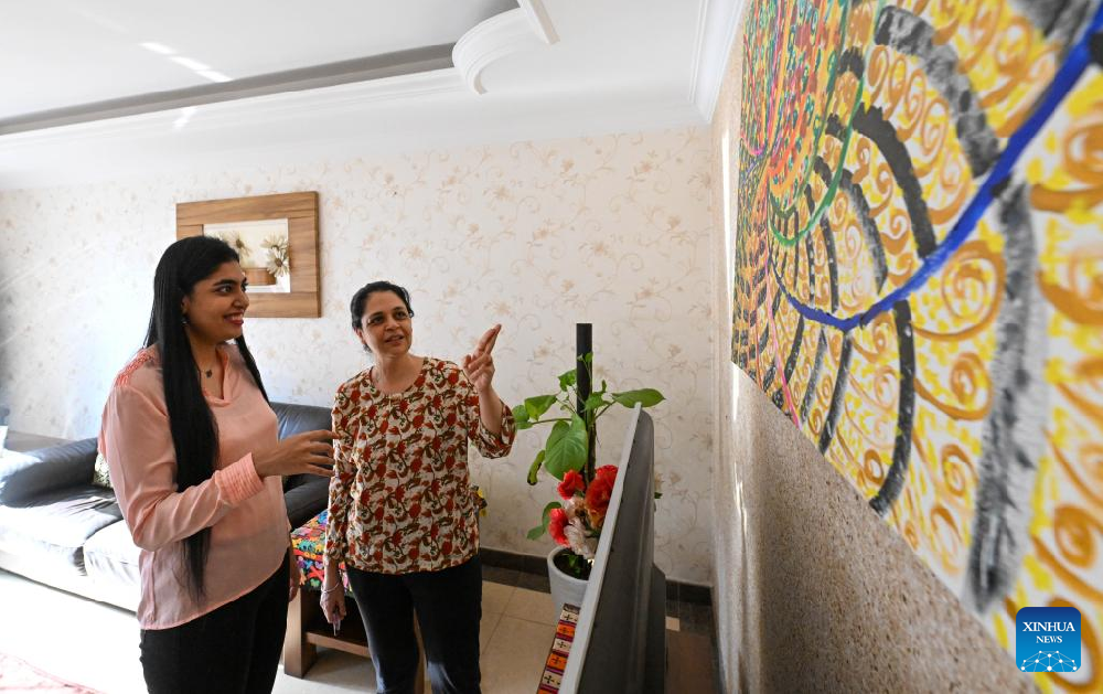Gurmehar Singh and her mother talk about one of her paintings at her home in north China's Tianjin, Nov. 22, 2022.