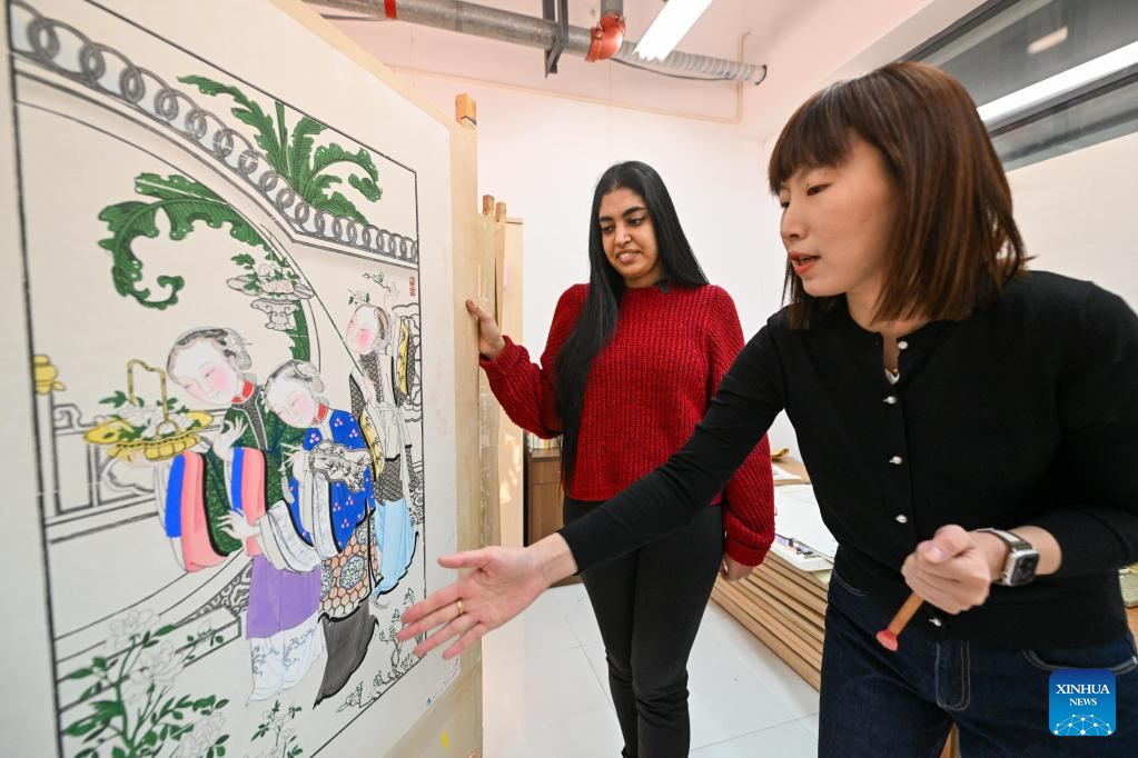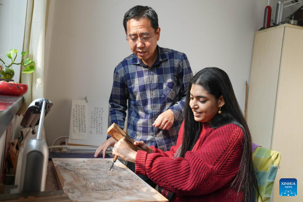 Gurmehar Singh learns how to create Yangliuqing woodblock prints under the instruction of artist Liu Jie in north China's Tianjin, Nov. 17, 2022.