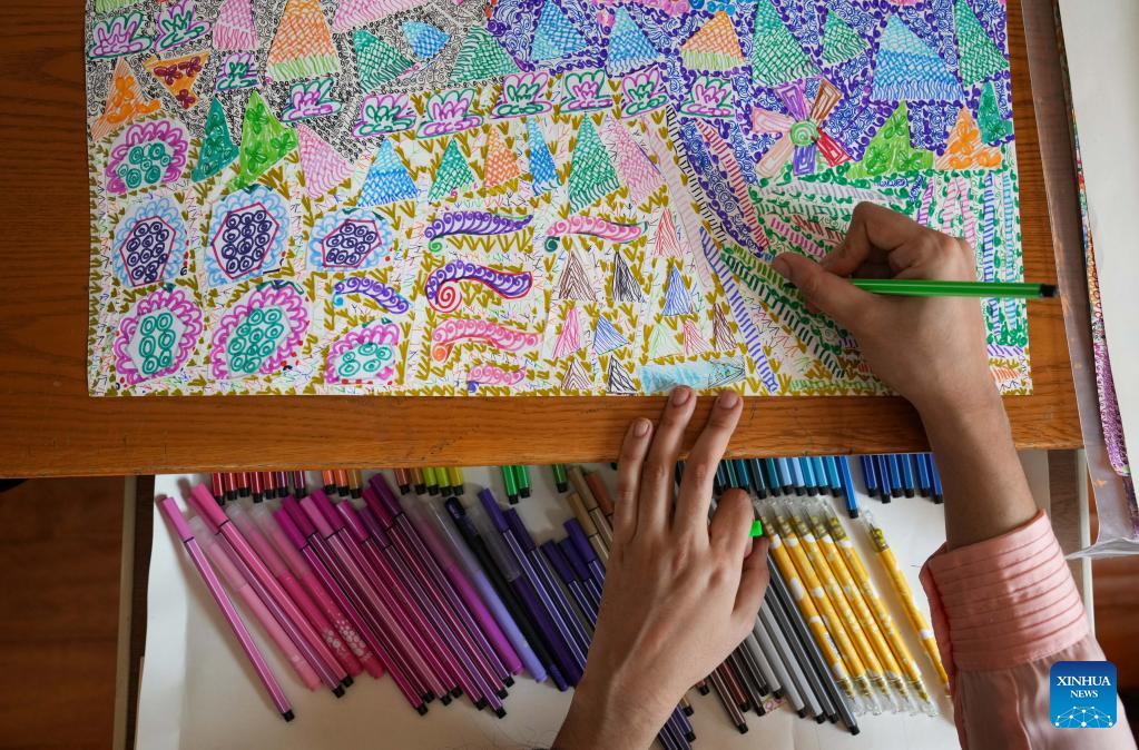 Gurmehar Singh creates a painting at home in north China's Tianjin, Nov. 22, 2022.