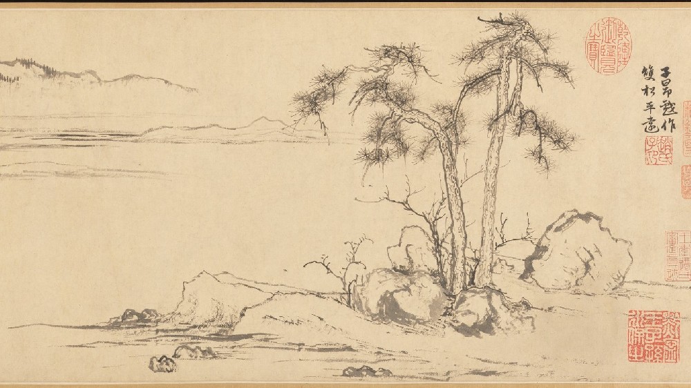 This spare, enigmatic scene represents a revolutionary redirection in Chinese painting. Zhao Mengfu reduces his "painted" landscape to a set of calligraphic brush conventions, with the rocks executed in "flying-white" cursive and the pines outlined in unmodulated seal script. He thus rejects illusionistic representation and relies instead on expressive brush lines to imbue his imagery with personal meaning.