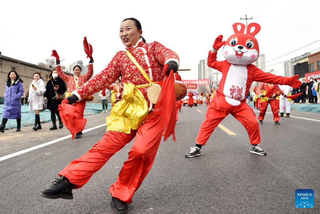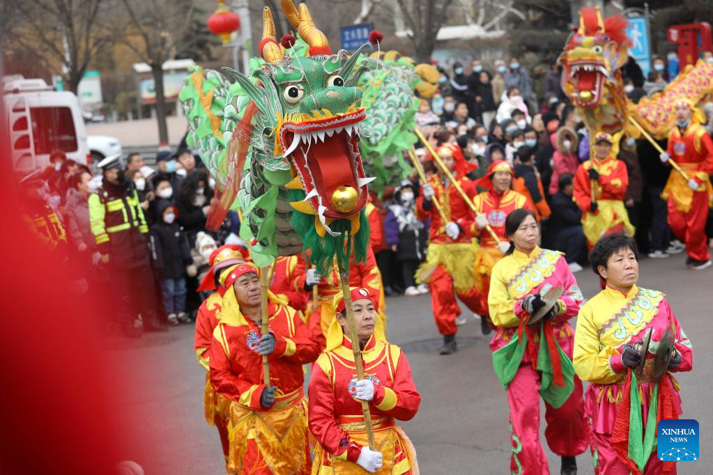 Folk artists interacts with visitors during a folk cultural activity in Yingze District of Taiyuan City, north China's Shanxi Province, Feb. 2, 2023. The Lantern Festival, the 15th day of the first month of the Chinese lunar calendar, falls on Feb. 5 this year. Various folk cultural activities were held to welcome the upcoming festival.