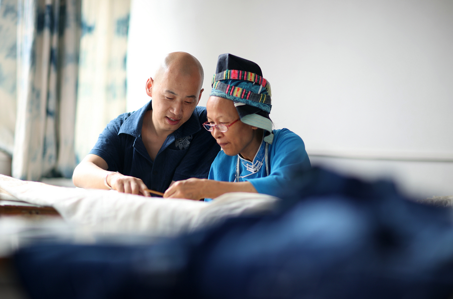 Fashion designer Cheng Hao (left) works with a local Miao woman at his studio in Danzhai county, Guizhou province, Aug 10, 2021. [Photo/Xinhua]