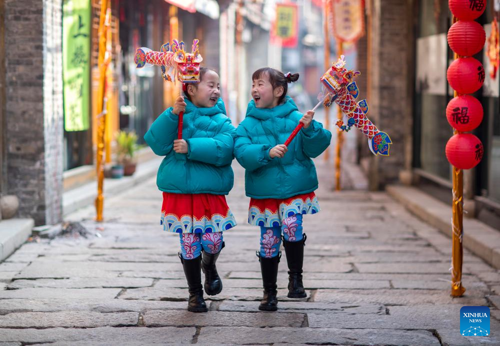 A pair of twins play at a cultural and tourism site in Xinghua City, east China's Jiangsu Province, Feb. 11, 2024. Many people choose to wear traditional Chinese costumes to celebrate the Chinese New Year. (Photo by Zhou Shegen/Xinhua)