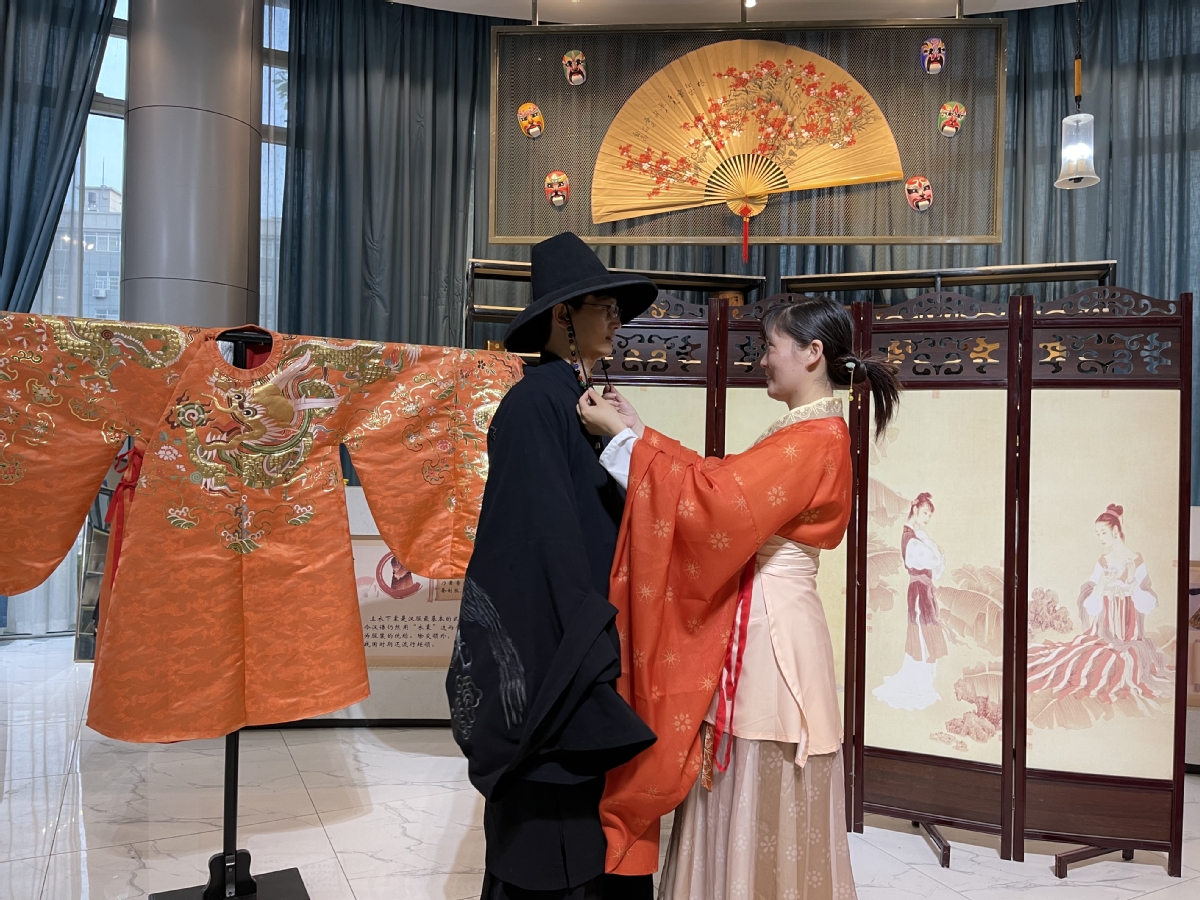 A staff member (right) of a hanfu company arranges attire for a model in Caoxian county, Shandong province, in 2021. CHINA DAILY