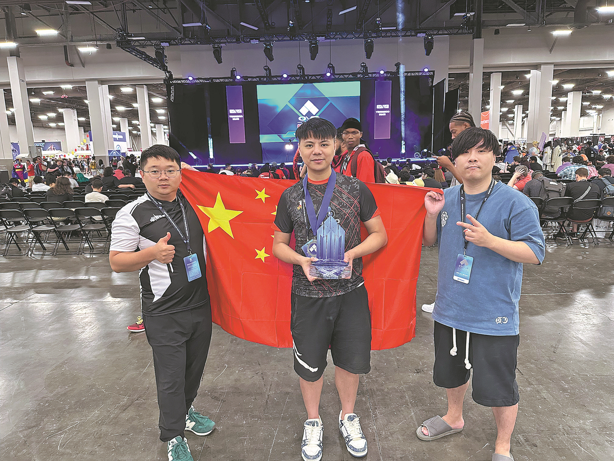 Chinese esports player Zeng Zhuojun (middle), better known as Xiaohai, is crowned The King of Fighters XV champion at EVO 2023 in Las Vegas, the United States, on Aug 6. [Photo/CHINA DAILY]