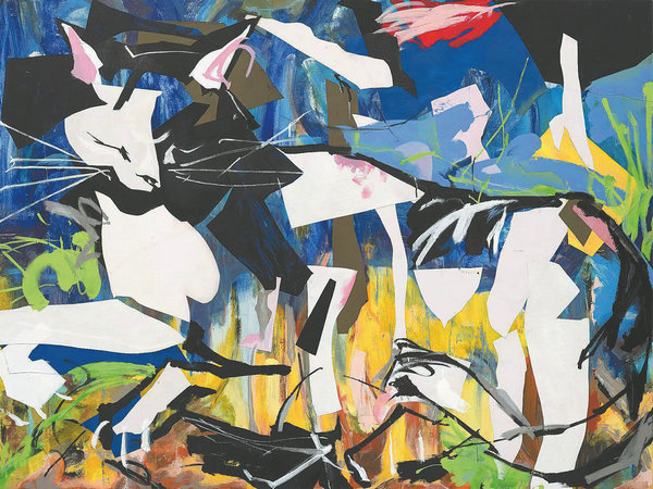 For the first layer of the background, he uses blue to represent the sky, yellow to represent reality, and green to signify nature. The background of the painting is abstract, preparing the environment for the appearance of the stray cats.