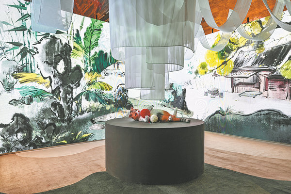 Drawing inspiration from the 12th-century scroll painting Along the River During the Qingming Festival, the exhibition hall's corridor has been transformed, with the aid of video, into an ancient bustling city, where cats wander through the market, adorning people's lives with their presence.