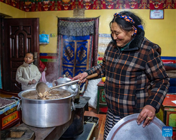 Sichod Wangmo's daughter-in-law cooks "gutu" at home in Damxung County, southwest China's Xizang Autonomous Region, Feb. 8, 2024.[Photo provided by Sun Fei/Xinhua]