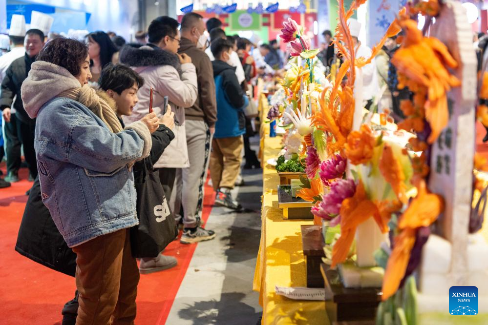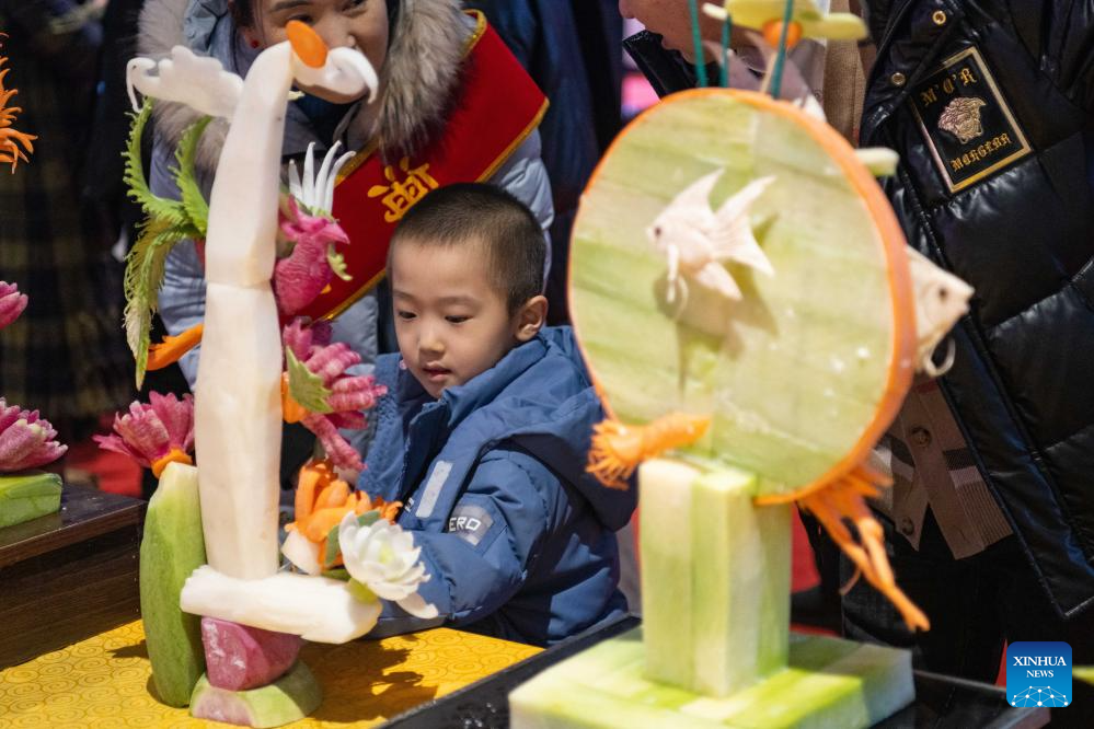 Tourists take photos of carvings made of vegetables and fruits during a food festival in Harbin, northeast China's Heilongjiang Province, Jan. 20, 2024. (Xinhua/Xie Jianfei)