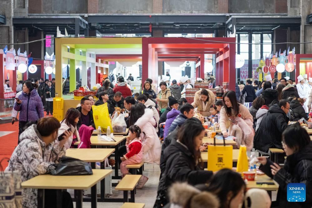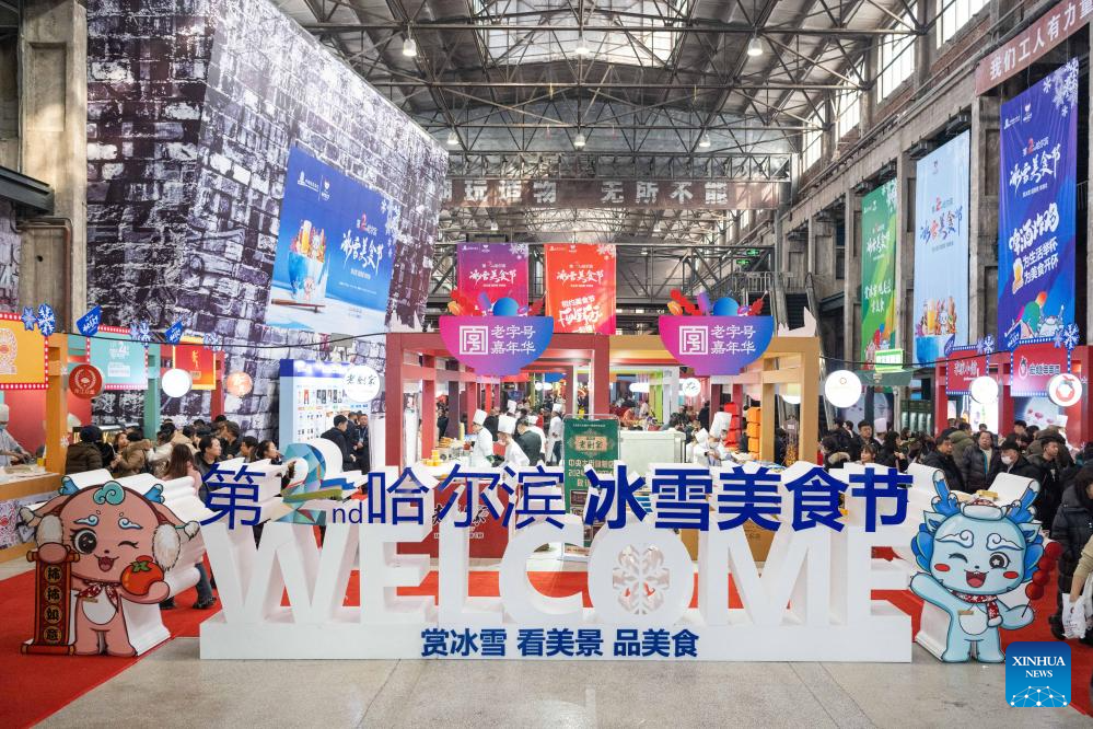 Tourists taste food during a food festival in Harbin, northeast China's Heilongjiang Province, Jan. 20, 2024. (Xinhua/Xie Jianfei)