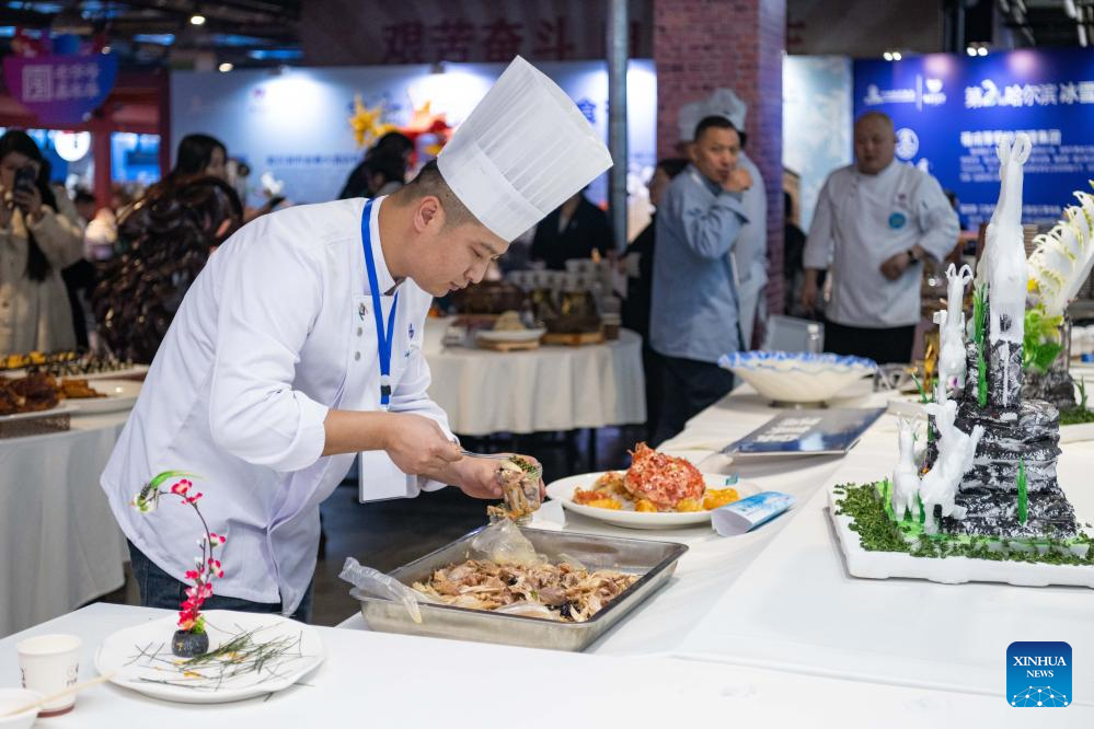 A chef cooks during a food festival in Harbin, northeast China's Heilongjiang Province, Jan. 20, 2024. (Xinhua/Xie Jianfei)
