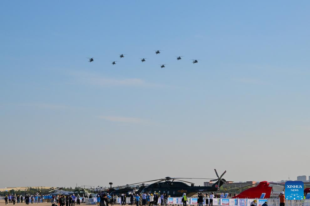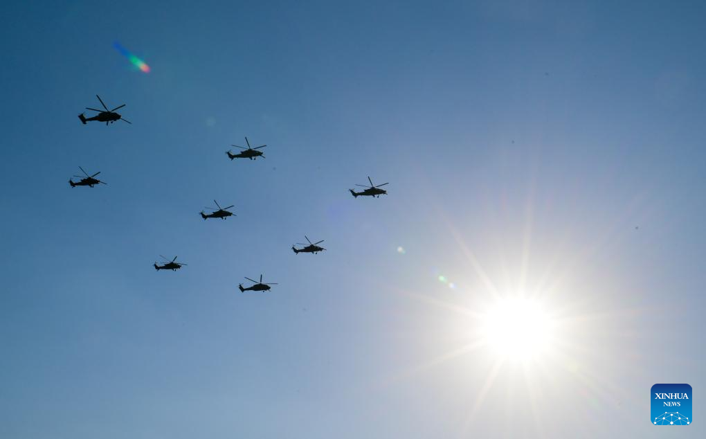 Helicopters rehearse for the upcoming 7th China Helicopter Exposition in Tianjin, north China, Oct. 14, 2025. The expo is scheduled to be held from Oct. 16 to 19 in Tianjin. (Xinhua/Li Ran)