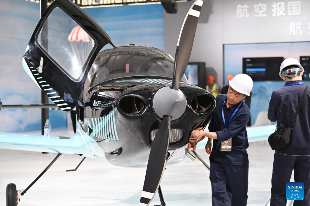 An exhibitor prepares for the upcoming 7th China Helicopter Exposition in Tianjin, north China, Oct. 14, 2025. The expo is scheduled to be held from Oct. 16 to 19 in Tianjin. (Xinhua/Sun Fanyue)