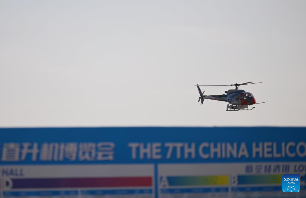A helicopter rehearses for the upcoming 7th China Helicopter Exposition in Tianjin, north China, Oct. 14, 2025. The expo is scheduled to be held from Oct. 16 to 19 in Tianjin. (Xinhua/Li Ran)