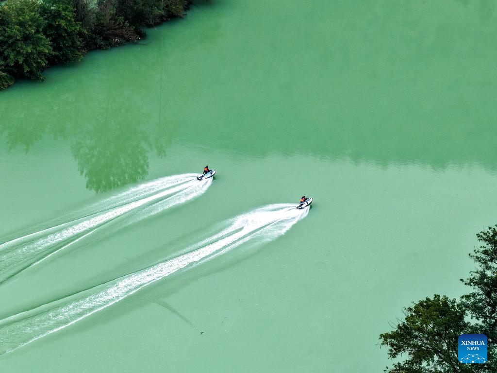 An aerial drone photo taken on Oct. 30, 2025 shows water sports enthusiasts trying jet skiing on the Apeng River near the Zhuoshui ancient town in Qianjiang District, southwest China's Chongqing Municipality. Situated in Qianjiang District of Chongqing, the Zhuoshui ancient town is a millennium-old town that emerged in the late Tang Dynasty (618-907) and flourished during the Ming and Qing dynasties (1368-1911).