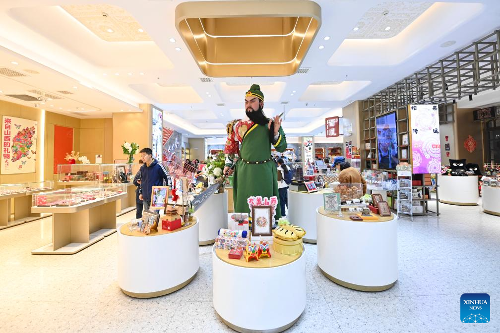 A visitor looks at a product in a shop at Zhonglou Street in Taiyuan, north China's Shanxi Province, Oct. 29, 2025. As both a commercial hub and cultural landmark of Taiyuan, Zhonglou Street carries a millennium of local history. However, rapid urban development once left it struggling with aging facilities, narrow spaces, and traffic congestion.