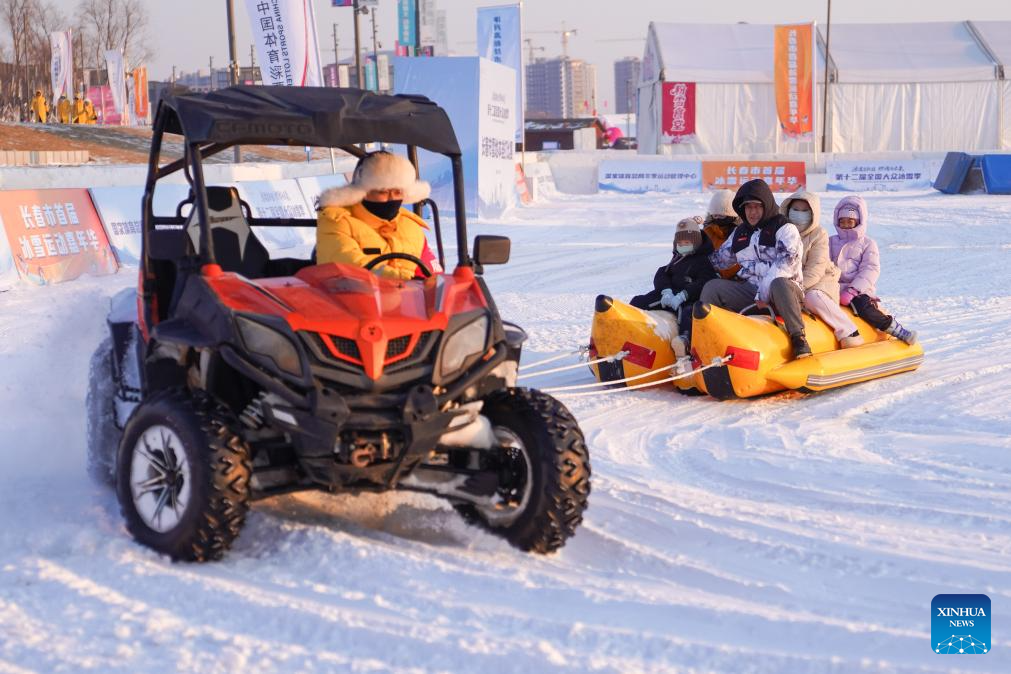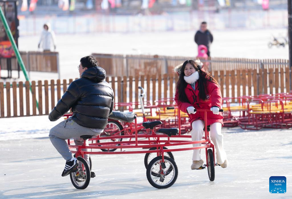 Tourists play on an ice rink in Changchun, northeast China's Jilin Province, Jan. 5, 2026. Changchun has set up a variety of distinctive ice and snow landscapes throughout urban areas this winter to lure tourists and encourage consumption. (Xinhua/Yan Linyun)