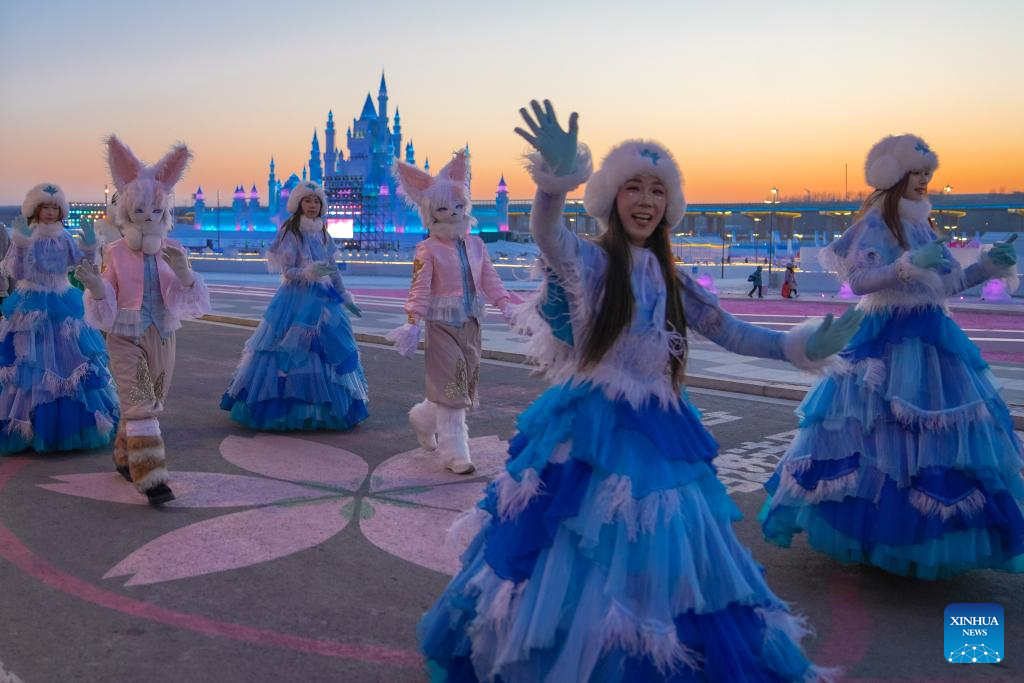 Parading performers wave to tourists at a park in Changchun, northeast China's Jilin Province, Jan. 5, 2026. Changchun has set up a variety of distinctive ice and snow landscapes throughout urban areas this winter to lure tourists and encourage consumption. (Xinhua/Xu Chang)