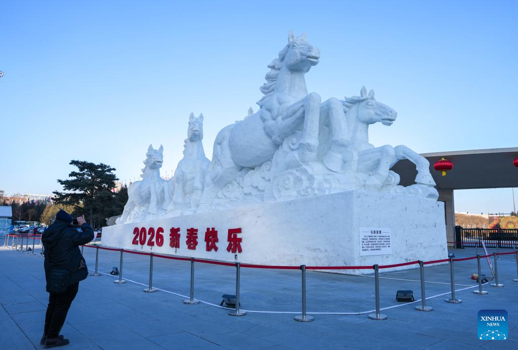 A tourist views a snow sculpture themed on Chinese zodiac Year of the Horse in Changchun, northeast China's Jilin Province, Jan. 5, 2026. Changchun has set up a variety of distinctive ice and snow landscapes throughout urban areas this winter to lure tourists and encourage consumption. (Xinhua/Yan Linyun)