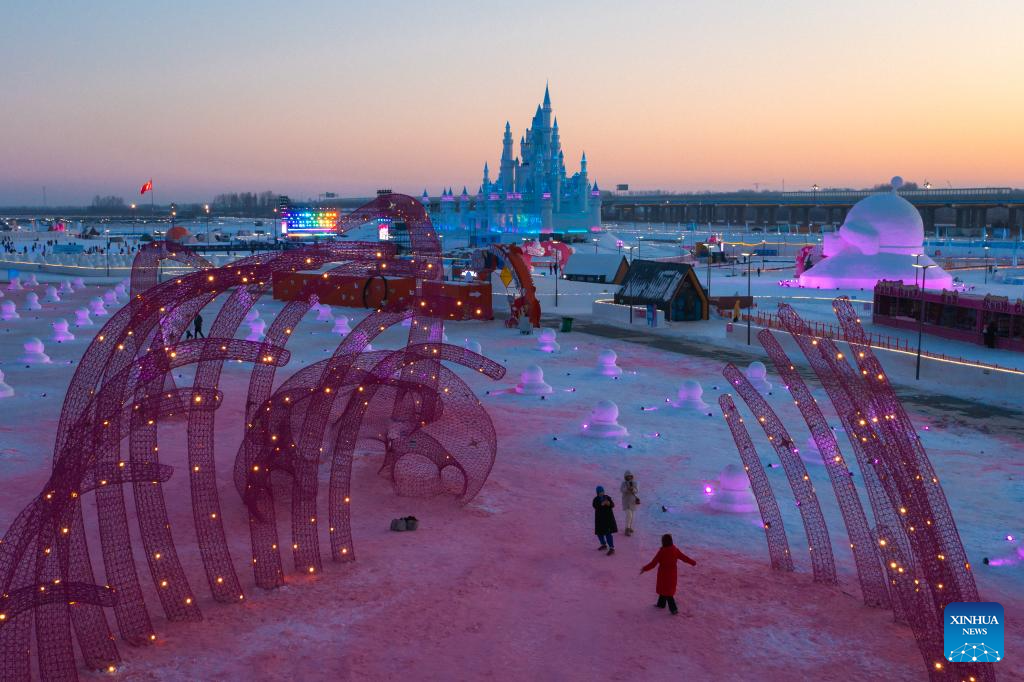 Tourists view ice-made art installations at a park in Changchun, northeast China's Jilin Province, Jan. 5, 2026. Changchun has set up a variety of distinctive ice and snow landscapes throughout urban areas this winter to lure tourists and encourage consumption. (Xinhua/Yan Linyun)
