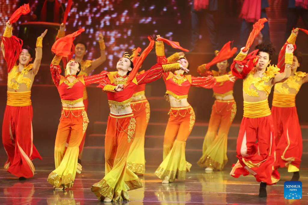Actresses of a dance troupe of Gansu's Zhangye City perform a dance during the first show of a mass cultural performance and broadcasting event held at the Lanzhou Concert Hall in Lanzhou, northwest China's Gansu Province, on Jan. 7, 2026. The mass cultural performance and broadcasting event, which plans to organize 240 mass cultural shows throughout the year, aims to build cultural and artistic stages for the general public at their doorsteps. (Xinhua/Chen Bin)