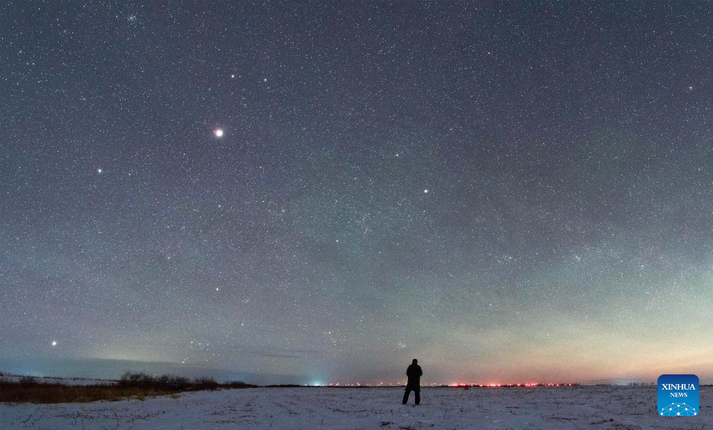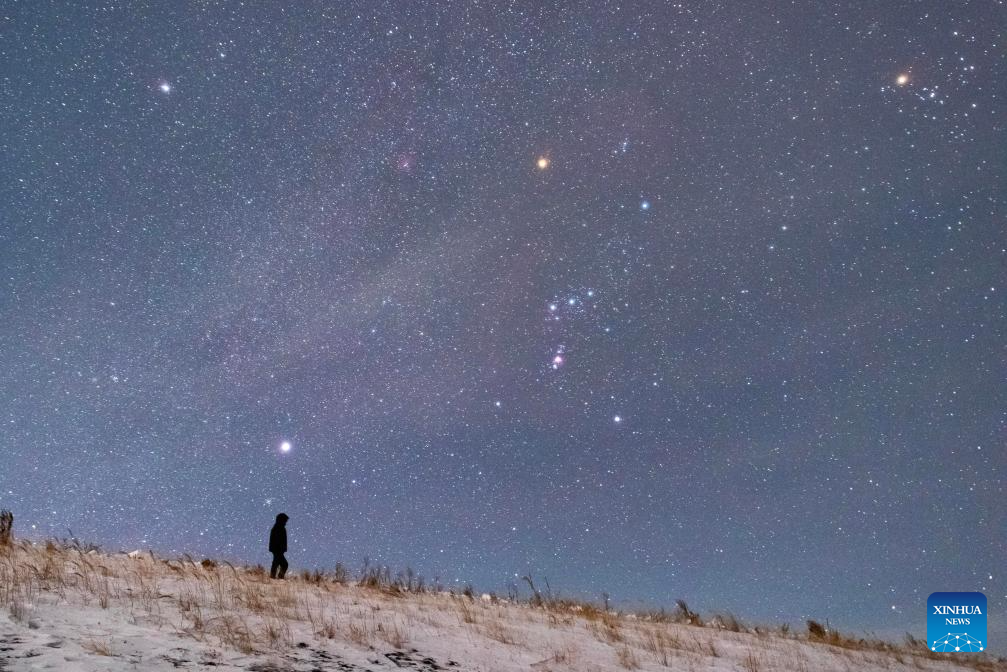 ▲This photo taken on Jan. 18, 2026 shows a view of the planet of Jupiter and the Orion in Jiamusi City, northeast China's Heilongjiang Province. China's northernmost Heilongjiang Province has entered the golden period for winter starry sky observation. With auroras occasionally making an appearance, the brilliant starry sky and the icy landscape together unfold a serene and breathtaking picture. (Photo by Zhu Zongqiang/Xinhua)