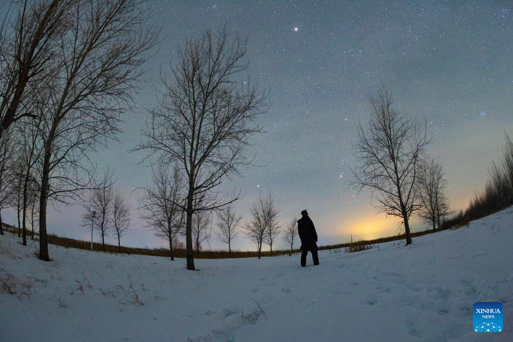 ▲This photo taken on Jan. 23, 2026 shows a view of the starry sky in Shuangyashan City, northeast China's Heilongjiang Province. China's northernmost Heilongjiang Province has entered the golden period for winter starry sky observation. With auroras occasionally making an appearance, the brilliant starry sky and the icy landscape together unfold a serene and breathtaking picture. (Photo by Han Yang/Xinhua)