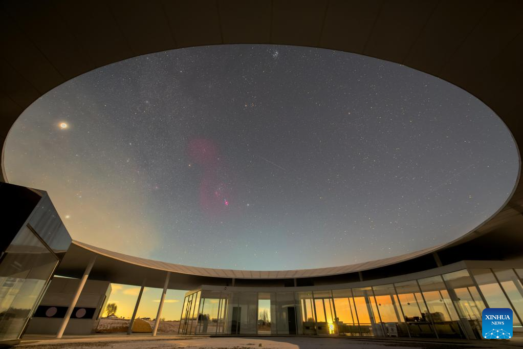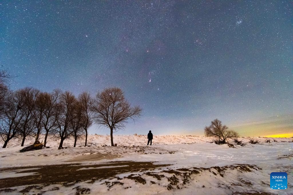 ▲This stack composite photo taken on Jan. 23, 2026 shows a view of the Orion in the Mongolian Autonomous County of Dorbod, Daqing City, northeast China's Heilongjiang Province. China's northernmost Heilongjiang Province has entered the golden period for winter starry sky observation. With auroras occasionally making an appearance, the brilliant starry sky and the icy landscape together unfold a serene and breathtaking picture. (Photo by Liu Wei/Xinhua)